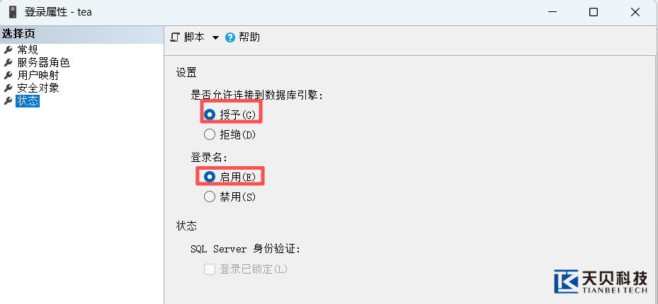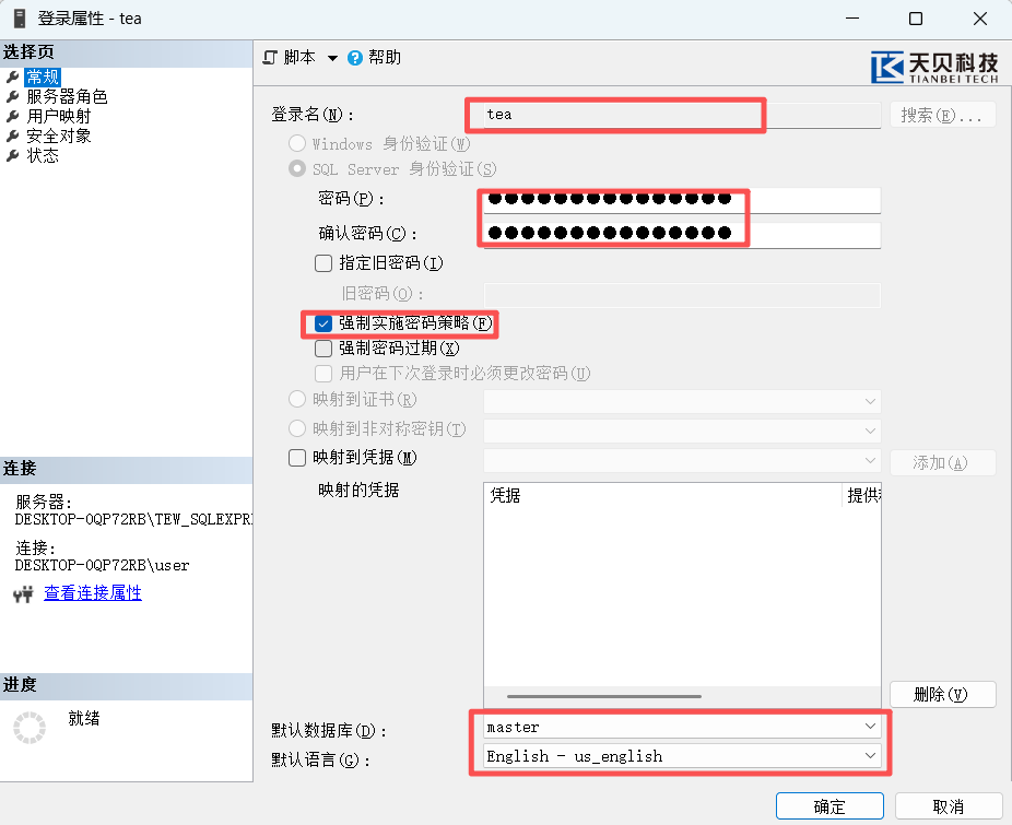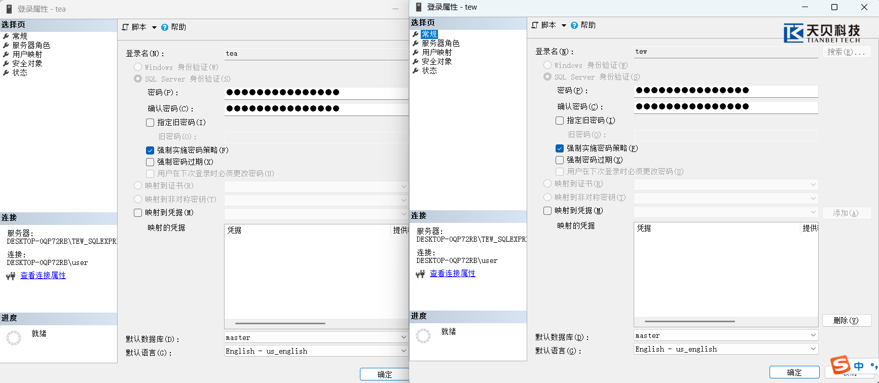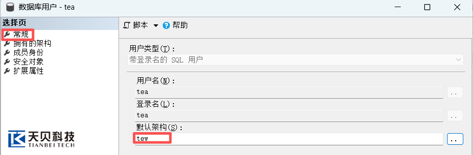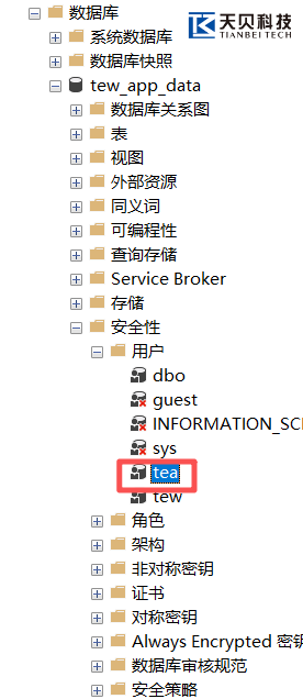l 对每个已映射的数据库(如 tew_app_data),右键点击【安全性】→【用户】→ 新建用户tea