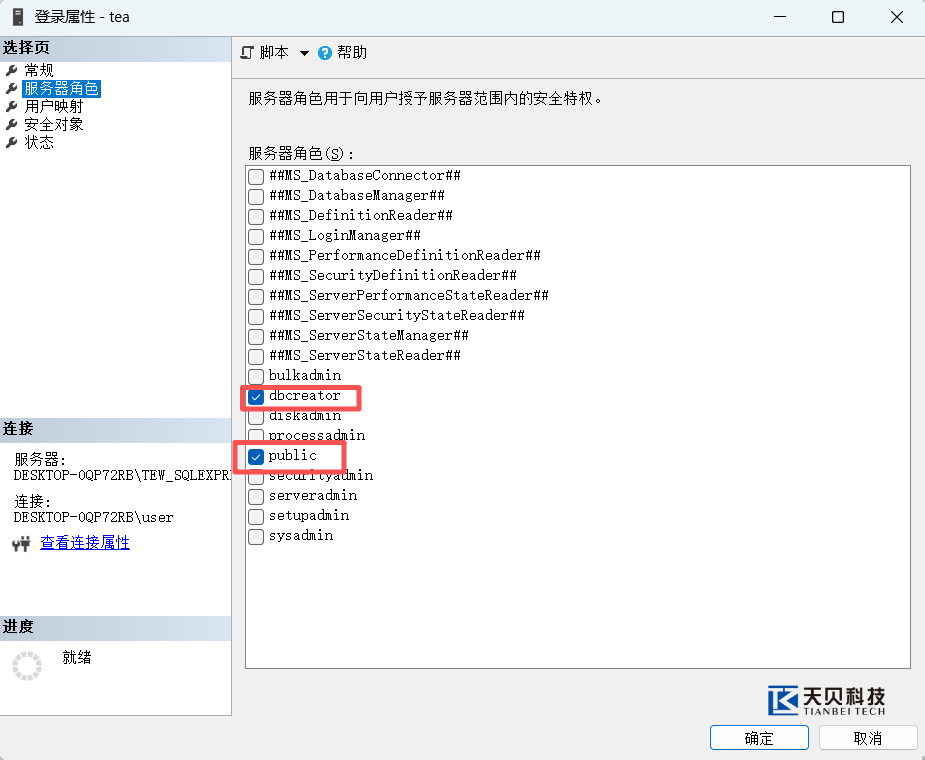 在【服务器角色】选项卡中,勾选public和dbcreator角色