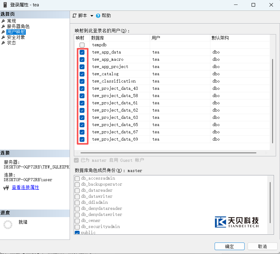 在【用户映射】选项卡中,勾选所有“tew_”开头的数据库