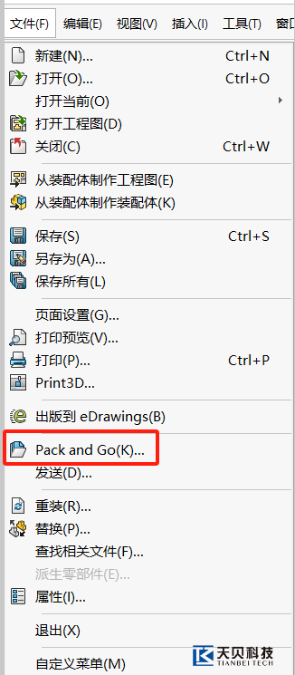 方法1,在SOLIDWORKS中打开目标的装配体,在菜单栏“文件”选项下面找到Pack and Go,点击它就会弹出Pack and Go对话框,如此就可以对指定的文件进行打包操作。