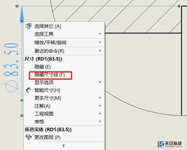 3.将鼠标移至标注线的两个箭头之间并选中,右键呼出菜单,选择隐藏尺寸线,完成标注。