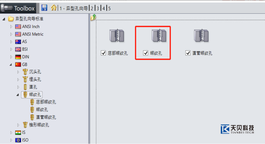 2,进入Toolbox设置界面,选择“异形孔向导”—“GB”—“螺纹孔”—“螺纹孔”