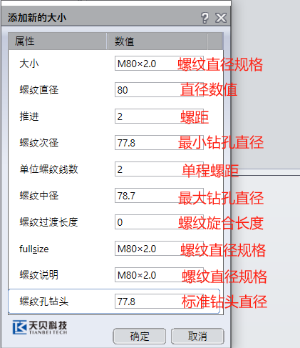3,进入当前螺纹孔库的尺寸规格编辑界面,以下是界面的说明。