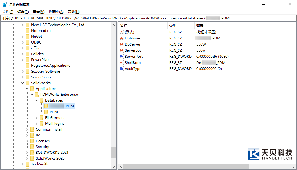 HKEY_LOCAL_MACHINE\SOFTWARE\WOW6432Node\SolidWorks\Applications\PDMWorks Enterprise\Databases\[库名称]